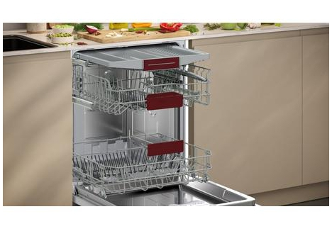 Take care of the dishes the easy way with this fully integrated smart dishwasher from NEFF. Equipped with Flex 2 baskets, you'll find six foldable flip tines in the top and bottom baskets for flexible loading. Plus, the three-stage Rack Matic top basket can be lifted anytime - even when fully loaded - for easy storage of larger items. Activate the ExtraDry option when you have difficult-to-dry loads or use the Extra Speed function to reduce cycle times by up to 66%. What's more, the S155HVX00G has room for 14 place settings as well as six cycles including the Chef 70oC option for tricky, burnt-on food.