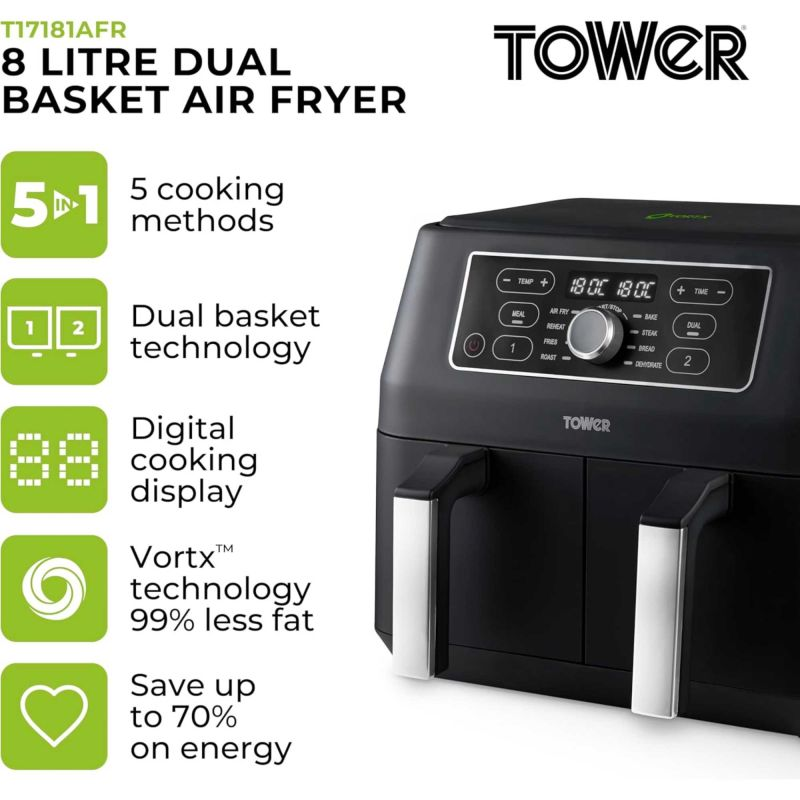 The Tower T17181AFR Vortx Dual Basket Air Fryer in black is an ideal kitchen appliance for healthier, faster, and more versatile cooking. This innovative air fryer features dual 4L baskets, allowing you to cook two different dishes simultaneously. Its spacious combined capacity of 8 litres means you can prepare generous portions, saving time without compromising on taste.