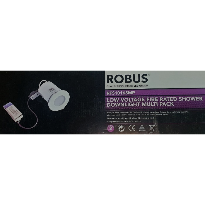 Each pre wired kit contains 5 x Die cast Fire Rated low voltage fittings, 5 x loop-in loop-out 70va dimmable electronic transformers and 5 x 3000 hour 50W dichroic lamps.