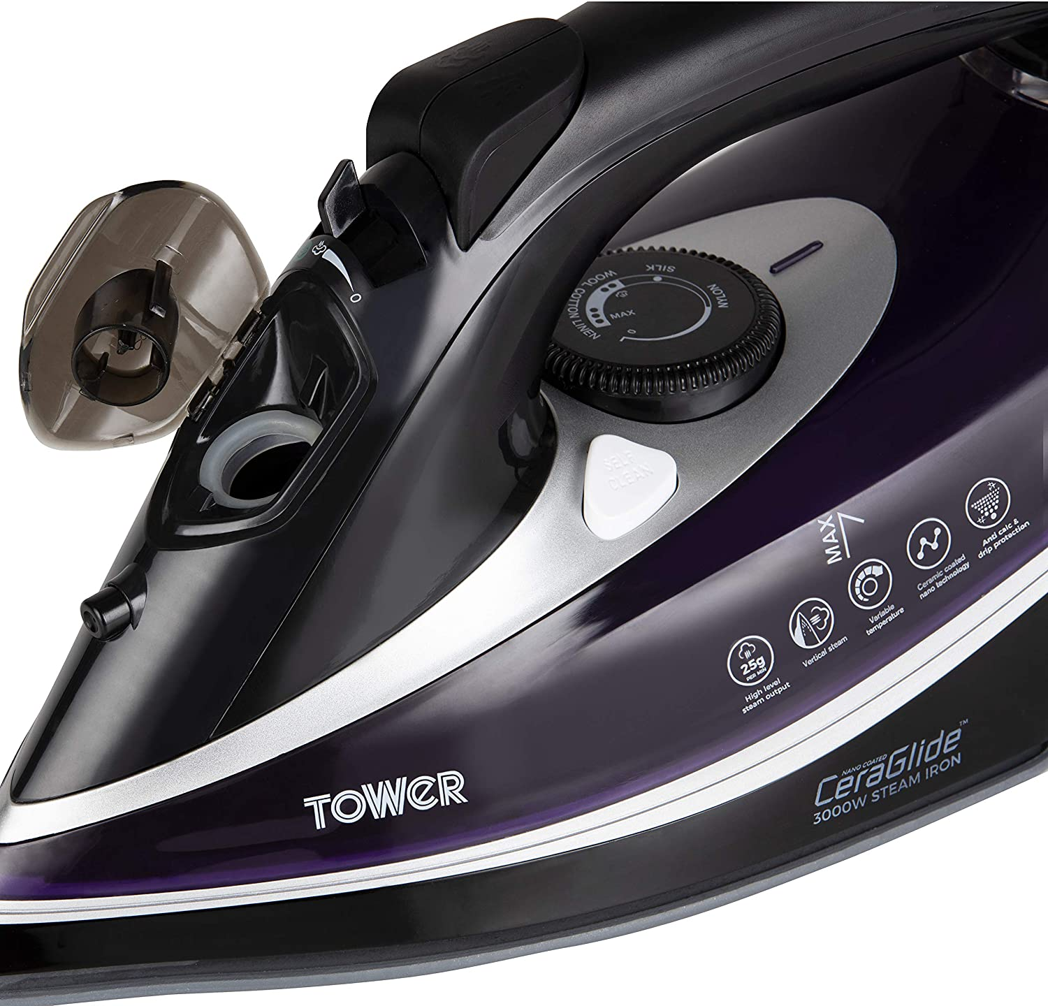 Glide through your ironing pile with the CeraGlide ultra speed ironing performance of this purple iron. With a 3100W performance that can be adjusted to varying temperatures for different fabrics, the soleplate delivers CeraGlide ceramic technology to make quick work of tough creases whilst remaining gentle on your linens. The variable steam selections offer a vertical steam for larger laundry items, a spray and steam and a 25g/minute steam burst so you can tackle all fabrics with minimal effort. Complete with a 360ml water tank this iron is packed with anti-scale, anti-drip and self-cleaning features, removing the need for regular maintenance whilst ensuring for a long lifespan